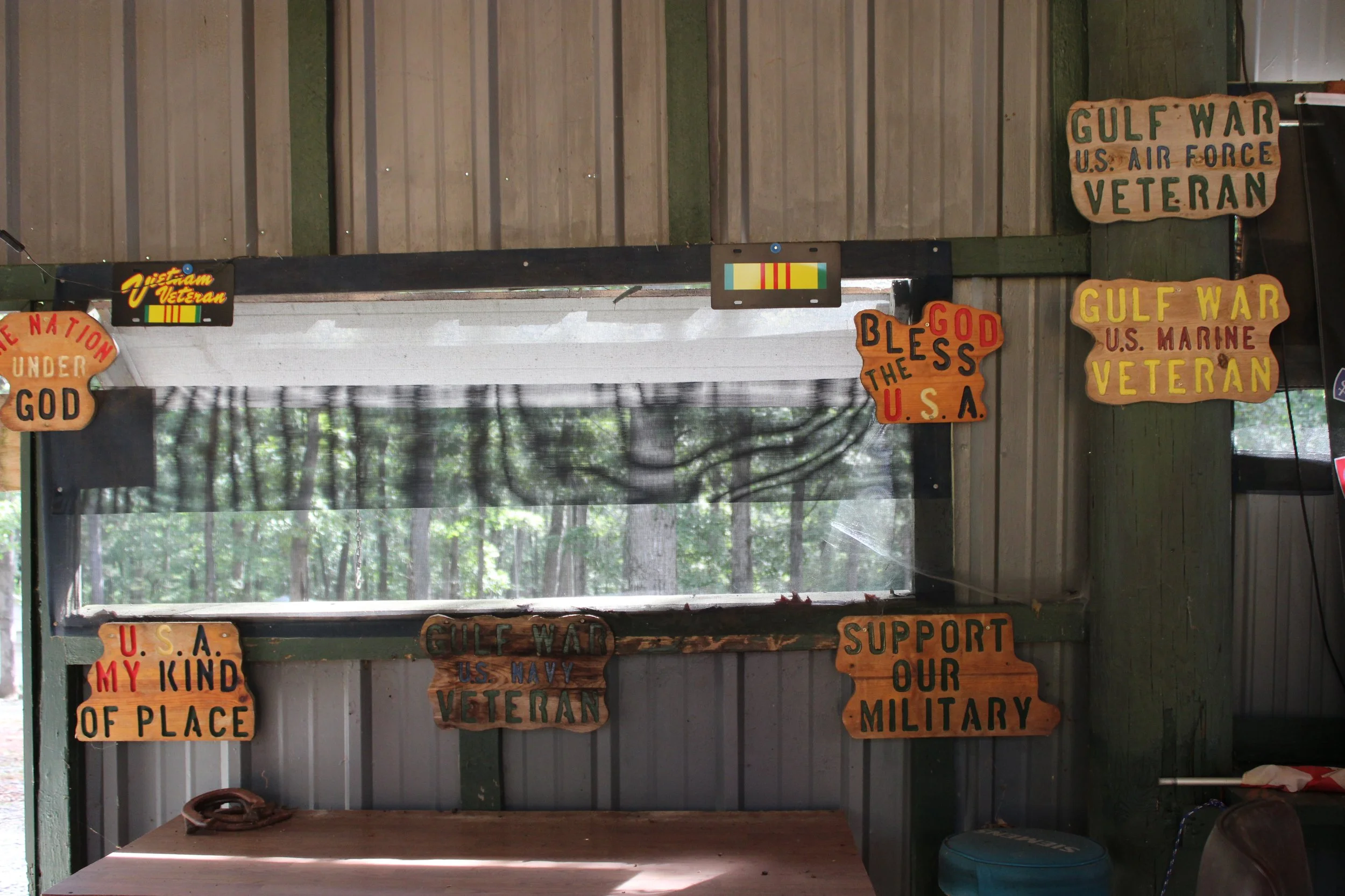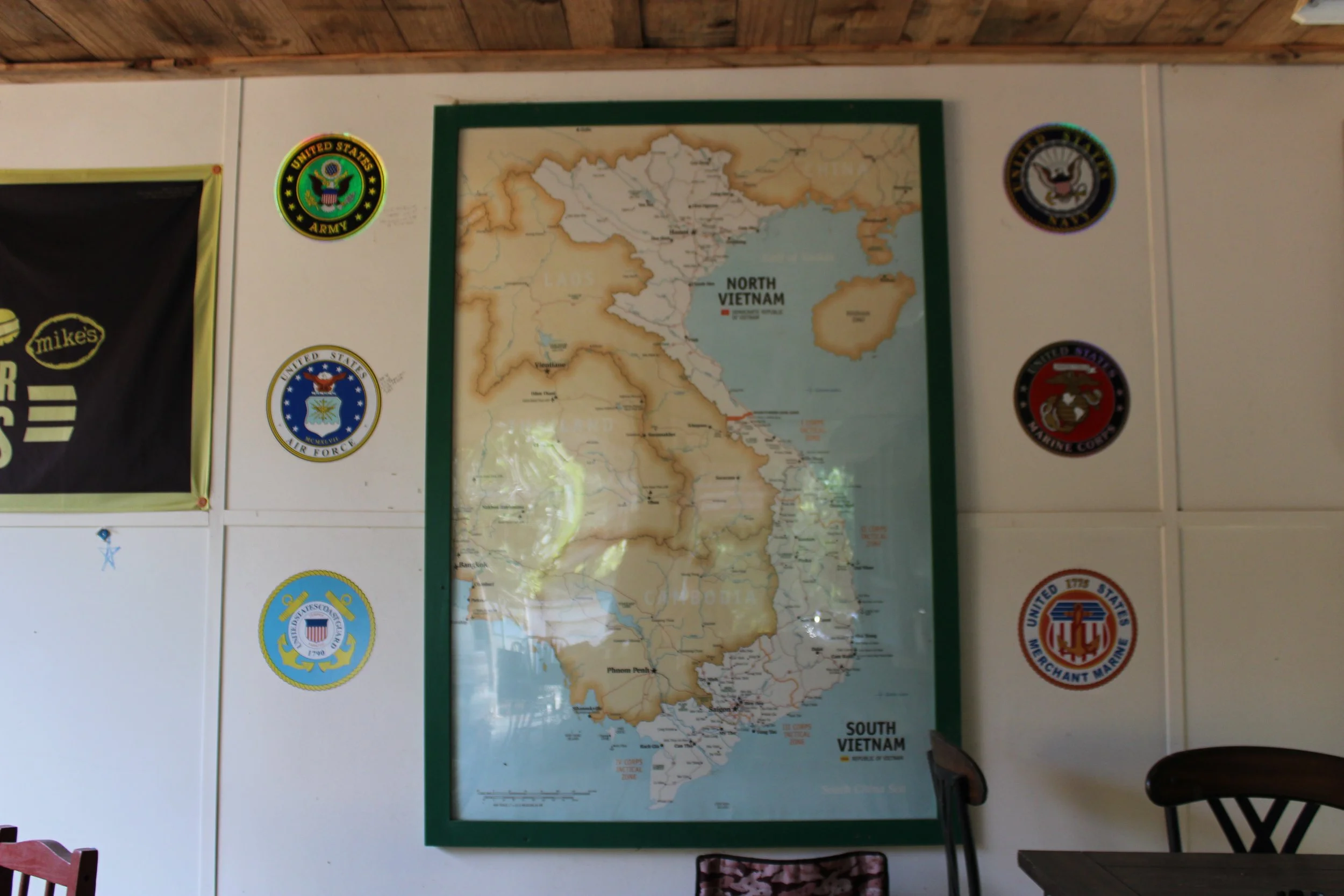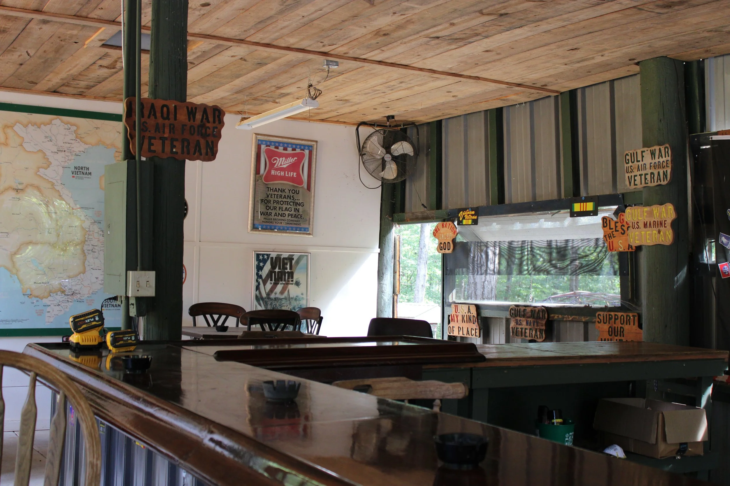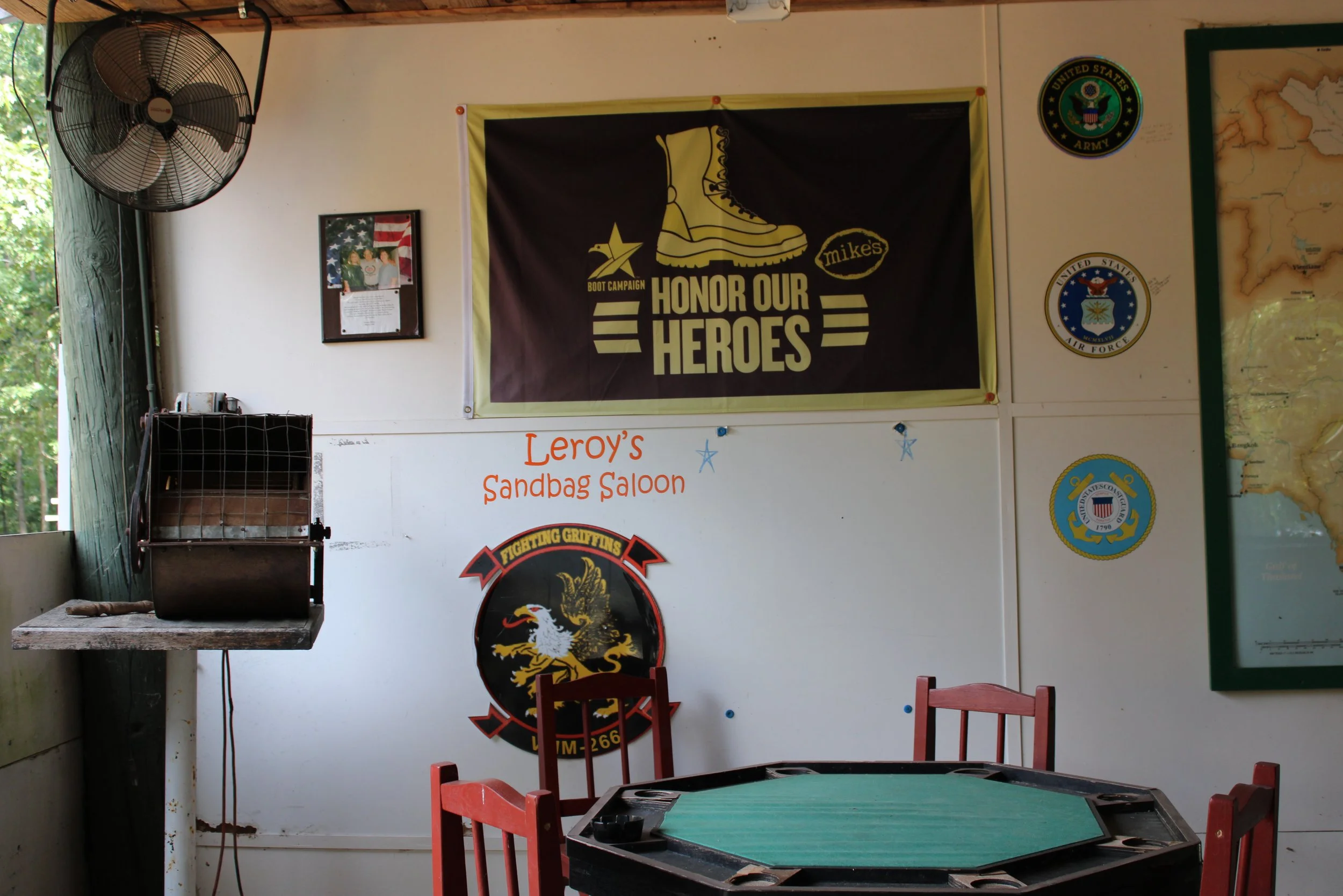 Six older men gathered together in a restaurant, some wearing veteran-related hats and jackets, with American flags and patriotic decorations in the background.