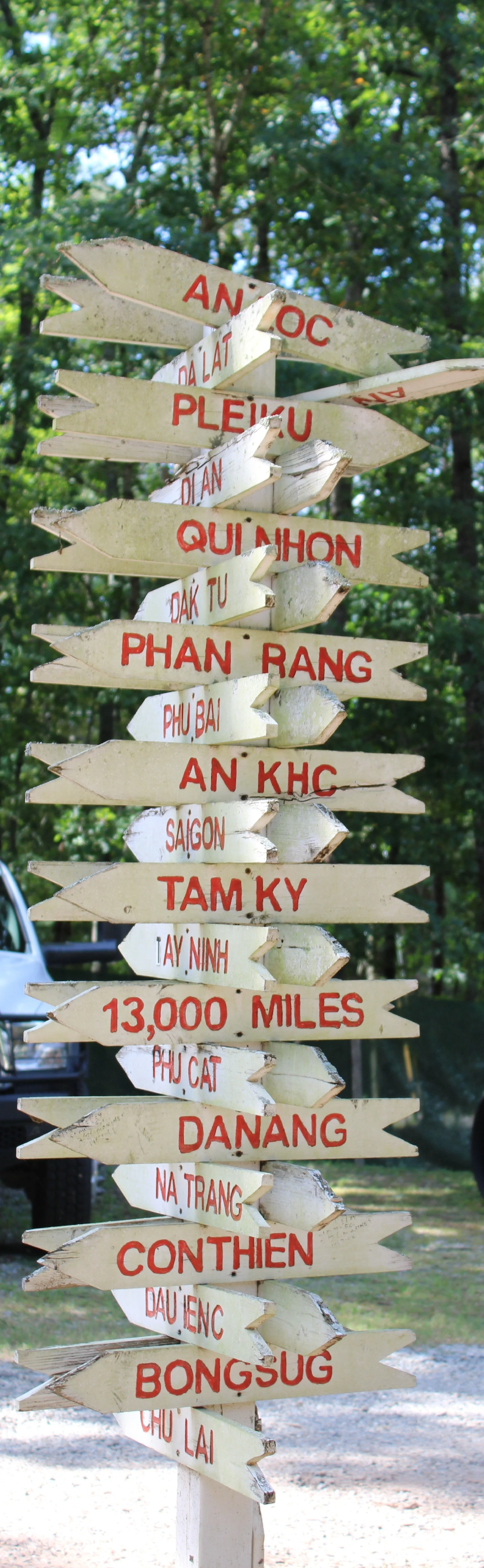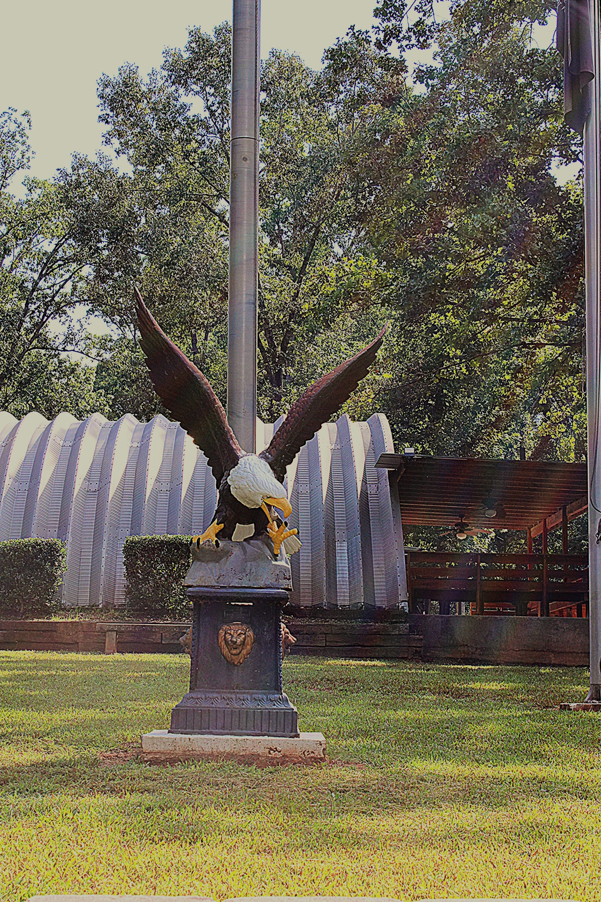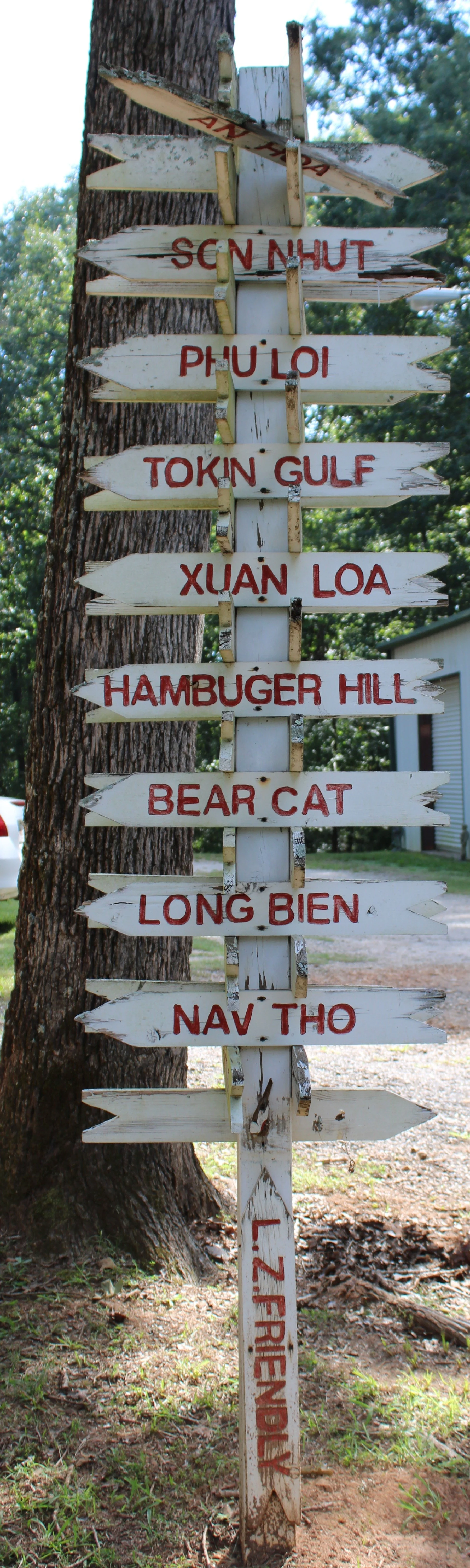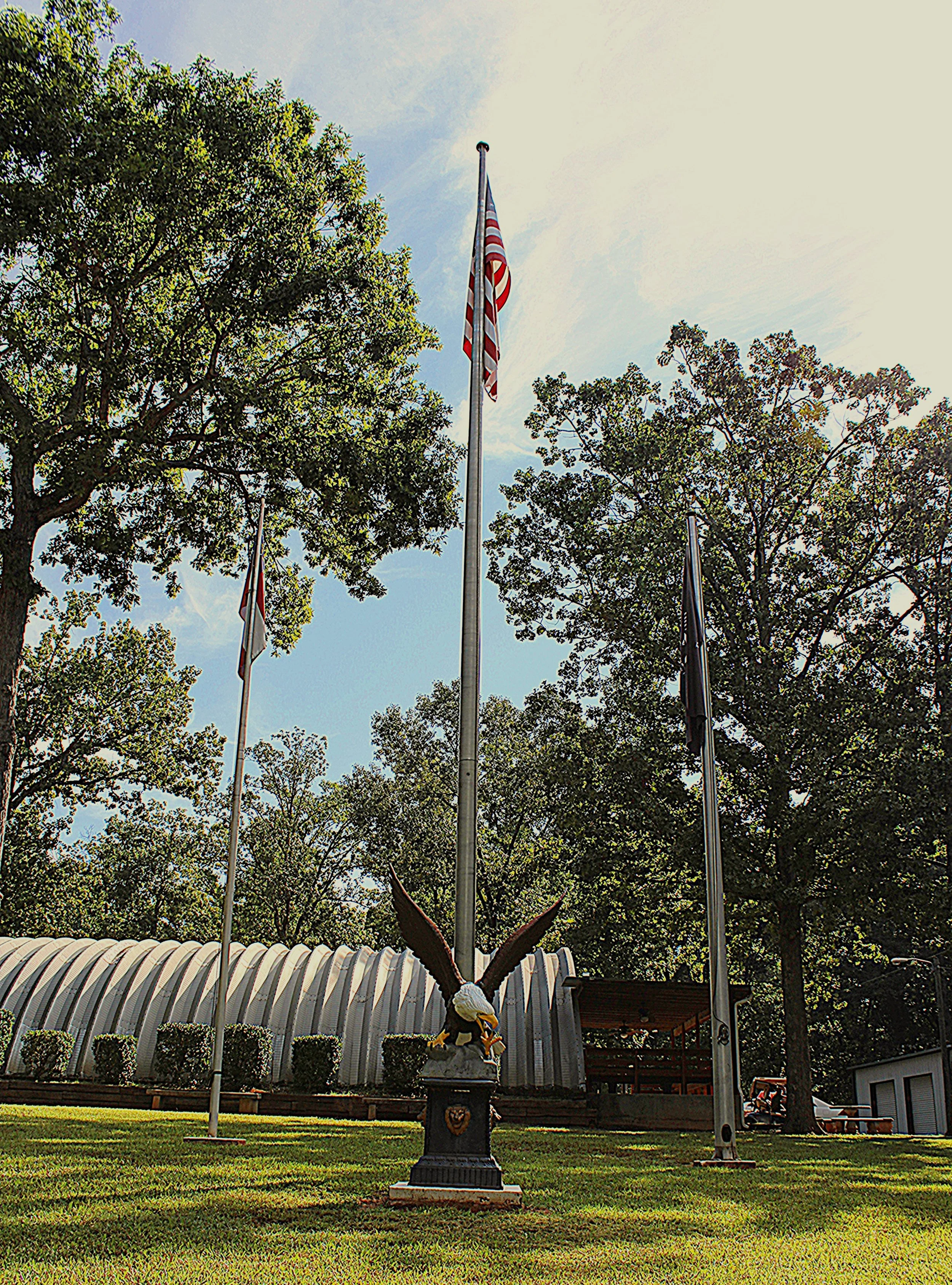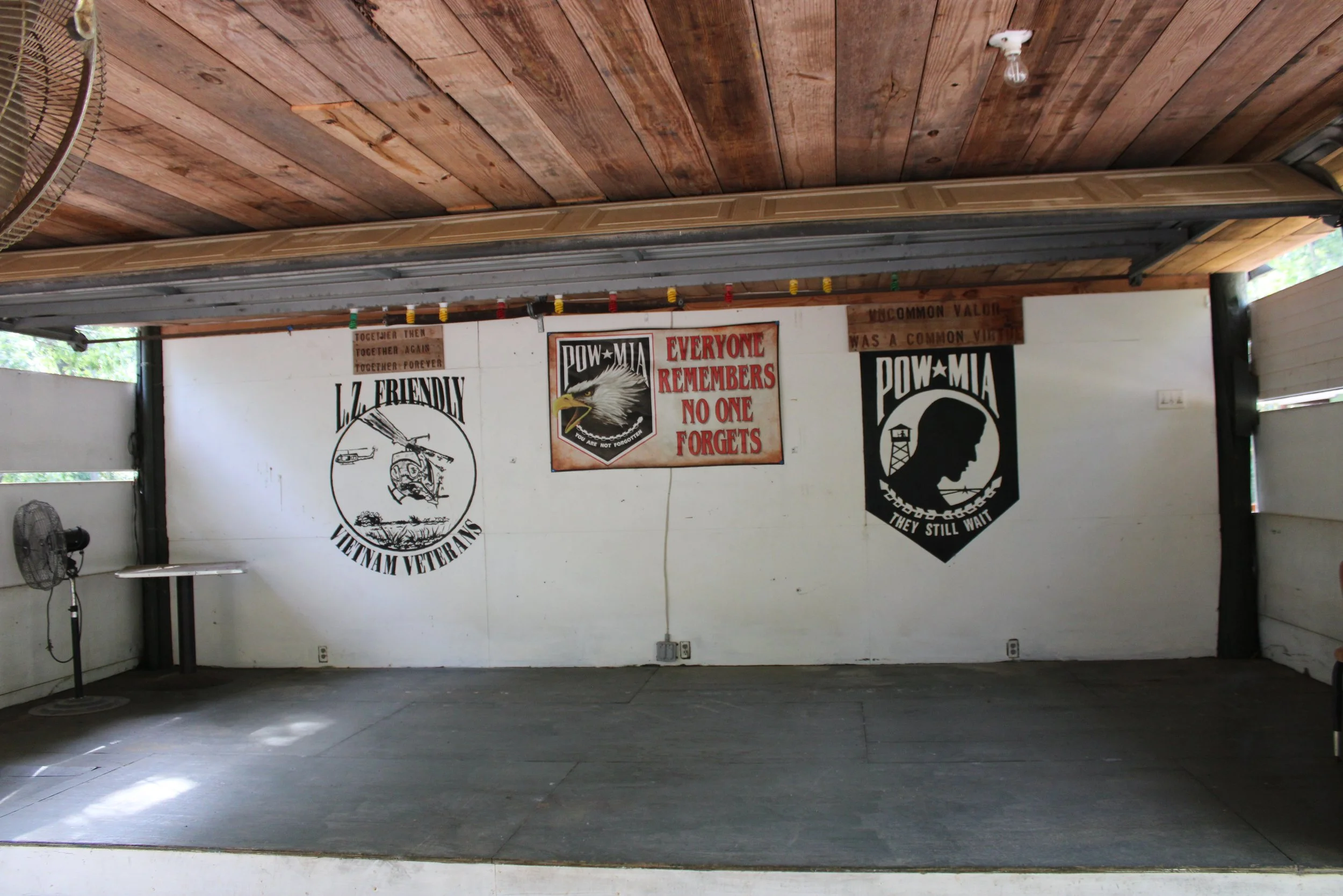 Six older men gathered together in a restaurant, some wearing veteran-related hats and jackets, with American flags and patriotic decorations in the background.