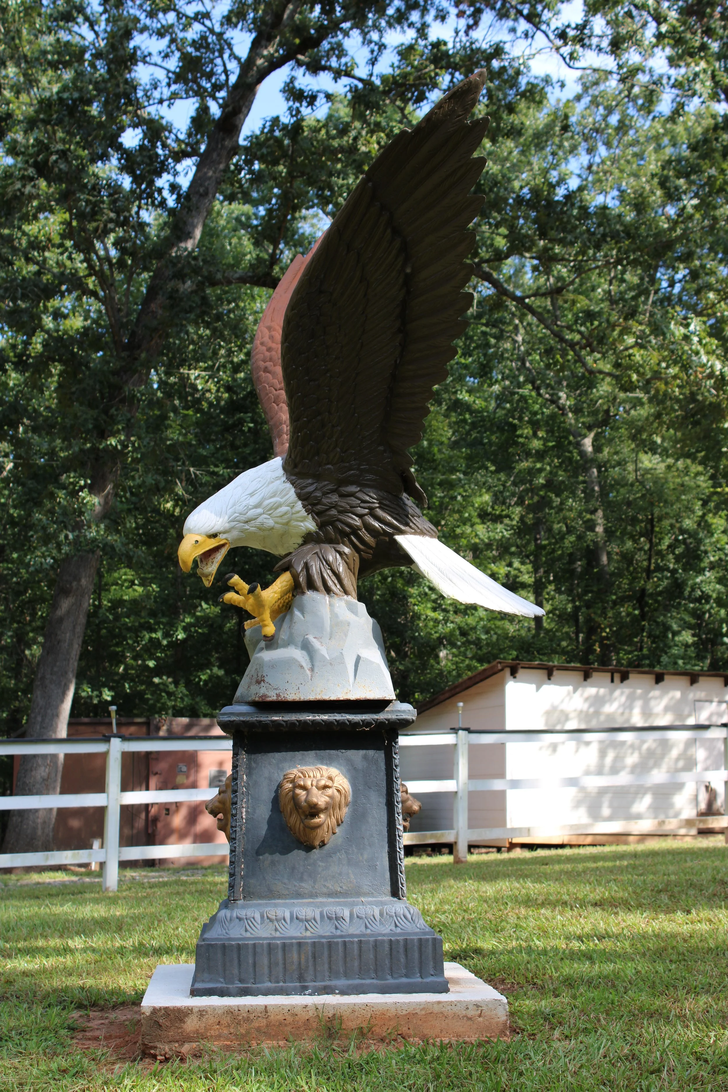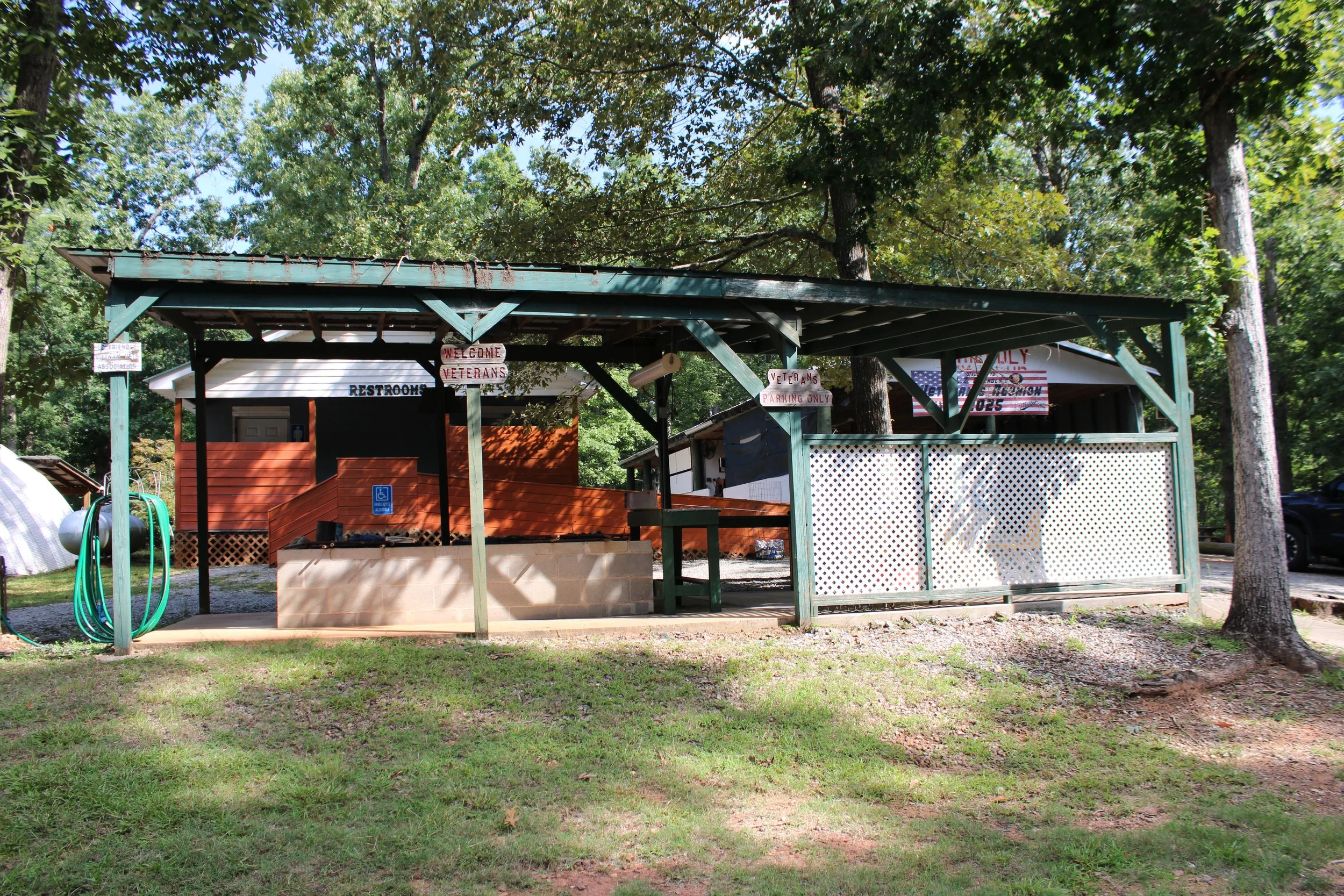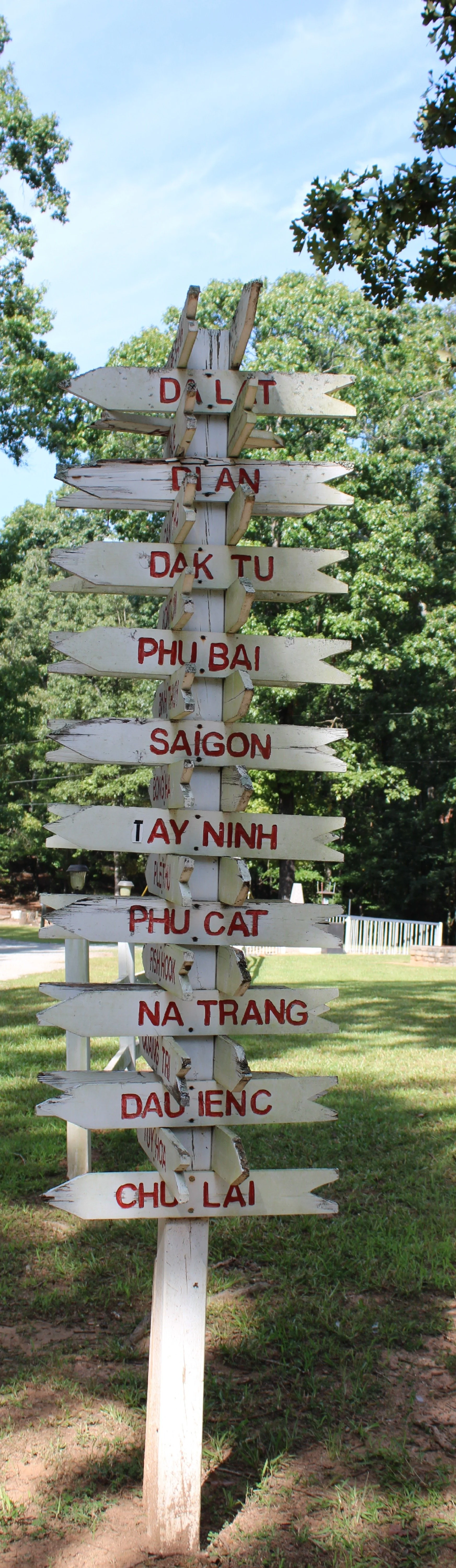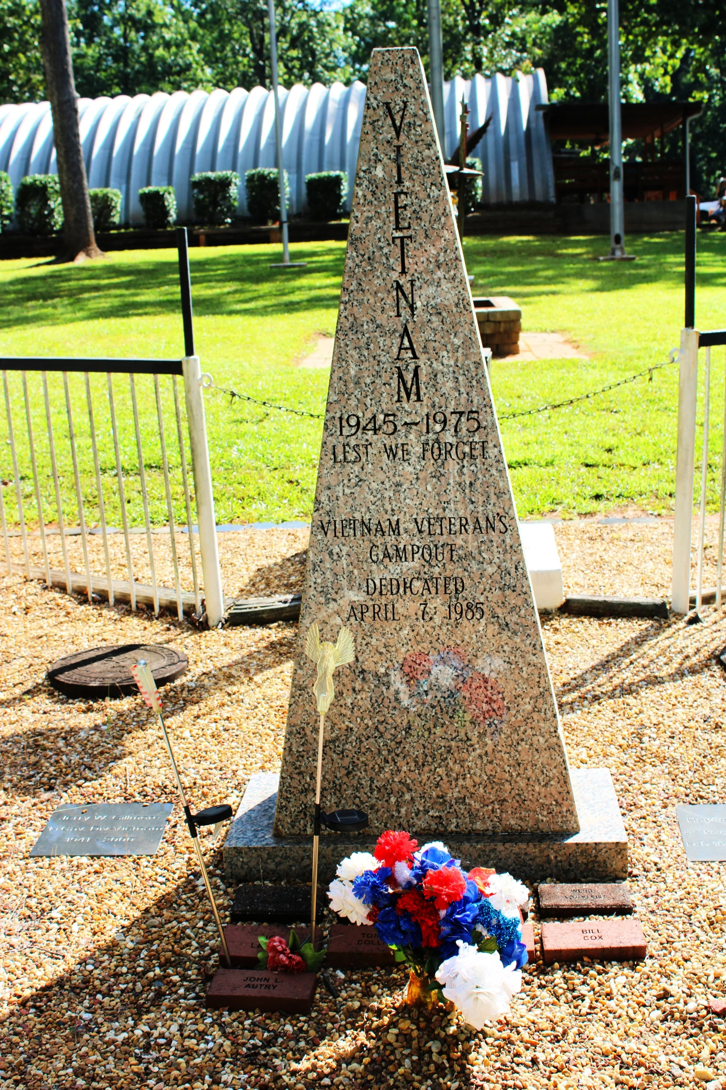 Six older men gathered together in a restaurant, some wearing veteran-related hats and jackets, with American flags and patriotic decorations in the background.