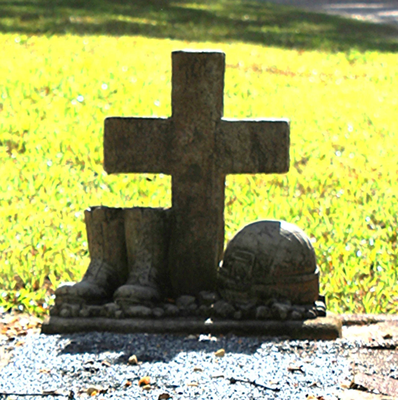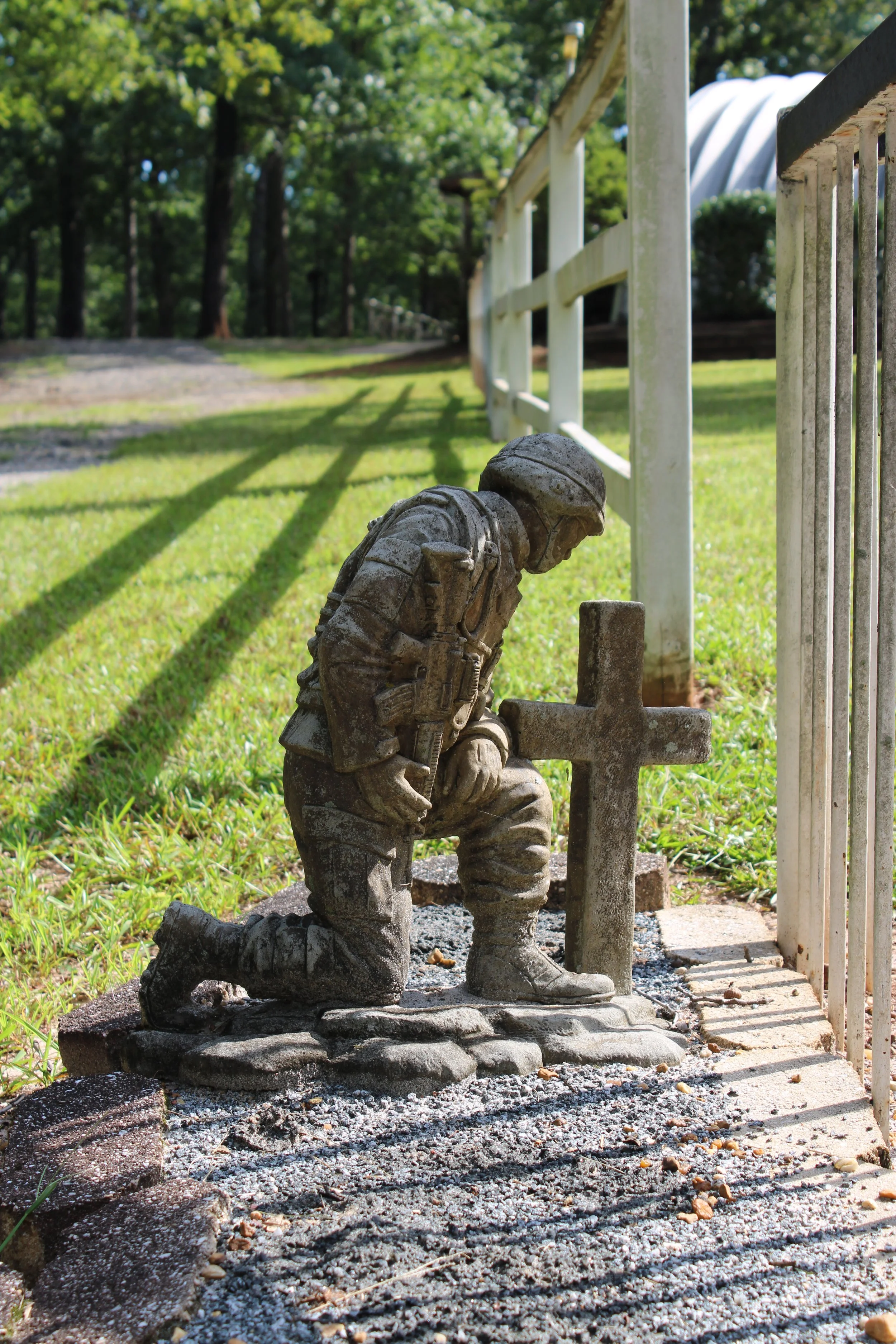 A soldier in uniform wearing a helmet, standing with hands behind his back, behind a blurred background.