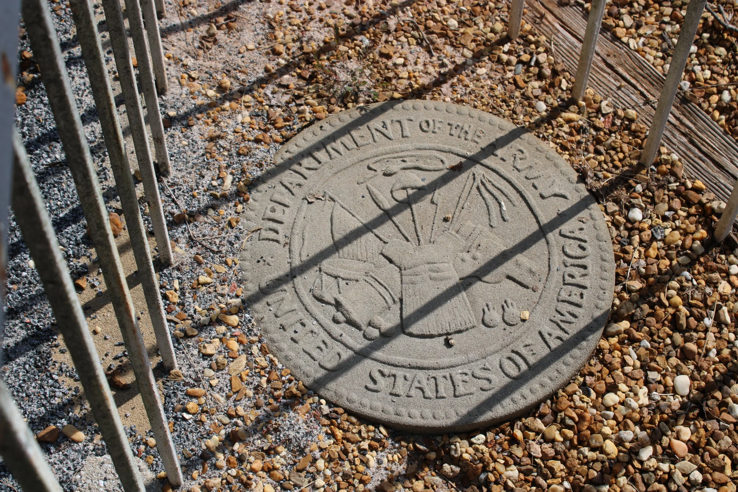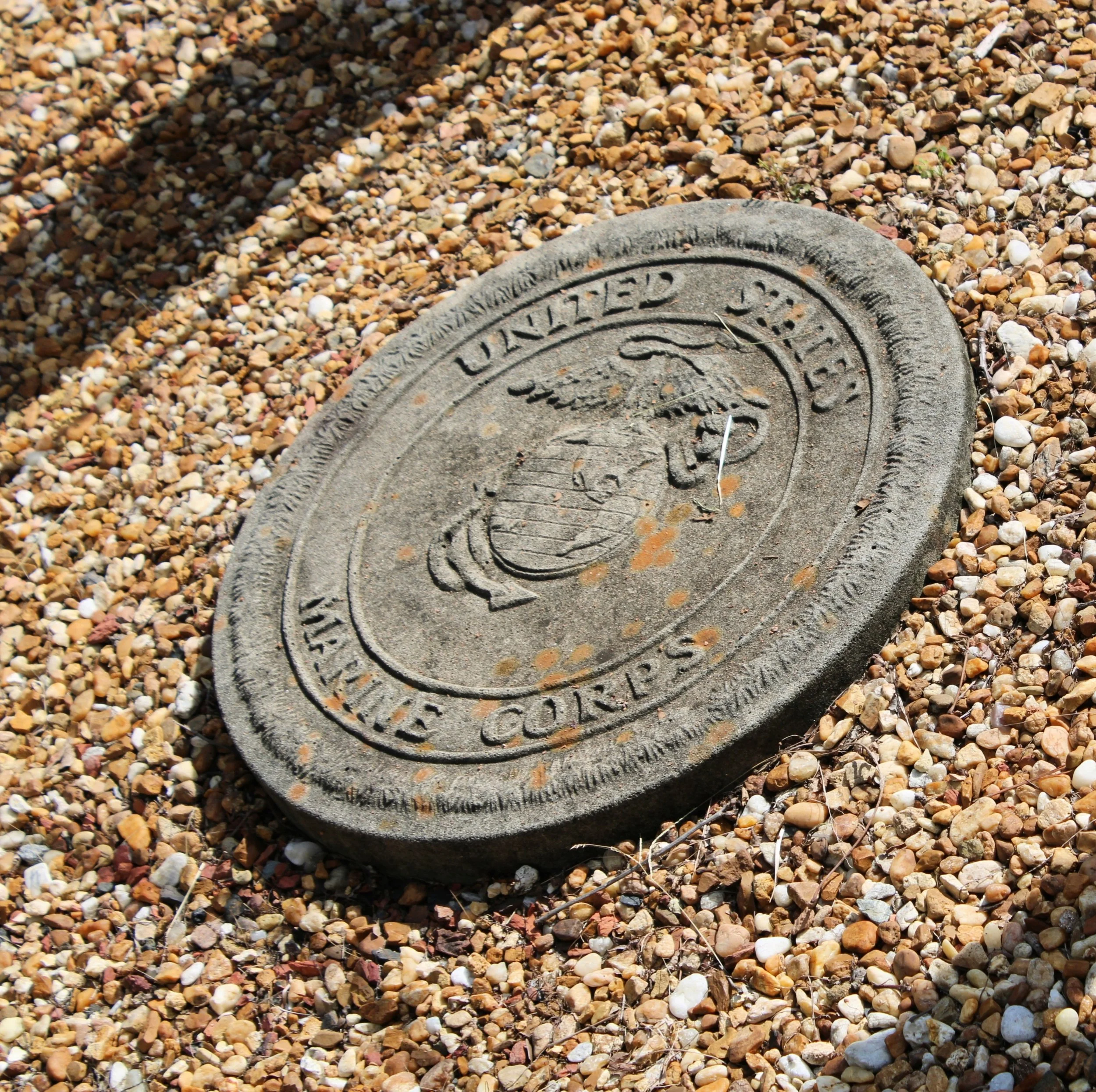 Photograph of a young man in a U.S. Marine Corps dress uniform, wearing a white cap with a Marine emblem, dark coat with gold buttons, and collar insignia.